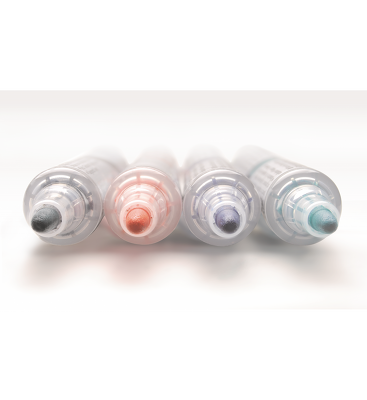 Marker do białych i ceramicznych tablic. Płynny tusz dozowany w razie konieczności nawilżenia końcówki za pomocą tłoczka (zamiast tradycyjnego sączka). Marker pisze wyrazistą linią aż do ostatniej kropli tuszu. Kilkakrotnie dłuższa linii pisania niż w standardowych markerach z sączkiem - 1200 m. Nie zawiera substancji trujących ksylenu ani toluenu. Nadaje się na papier, plastik, karton, tablice suchościeralne.