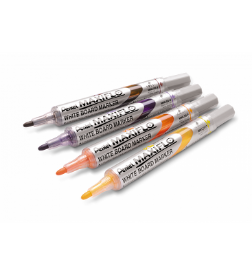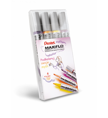 Marker do białych i ceramicznych tablic. Płynny tusz dozowany w razie konieczności nawilżenia końcówki za pomocą tłoczka (zamiast tradycyjnego sączka). Marker pisze wyrazistą linią aż do ostatniej kropli tuszu. Kilkakrotnie dłuższa linii pisania niż w standardowych markerach z sączkiem - 1200 m. Nie zawiera substancji trujących ksylenu ani toluenu. Nadaje się na papier, plastik, karton, tablice suchościeralne. Zestaw zawiera 4 markery Maxiflo.