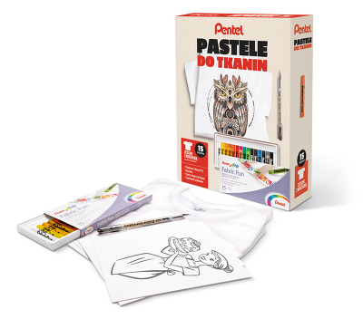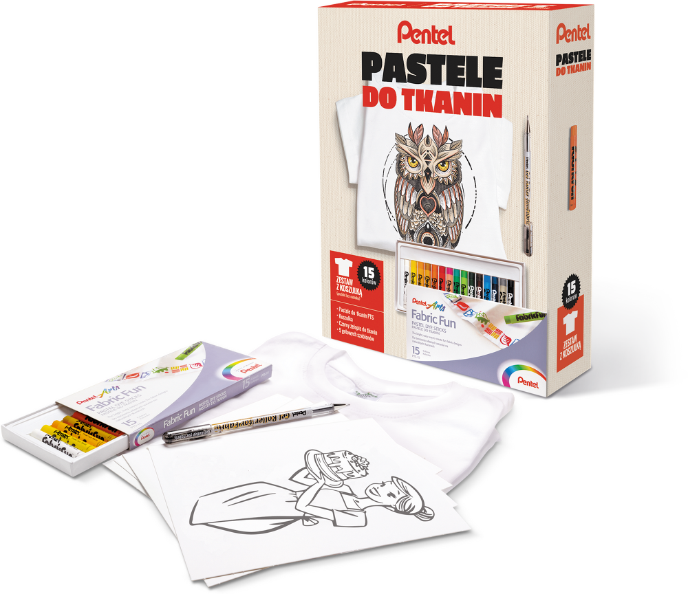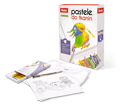 W zestawie: pastele do tkanin, długopis żelowy, koszulka