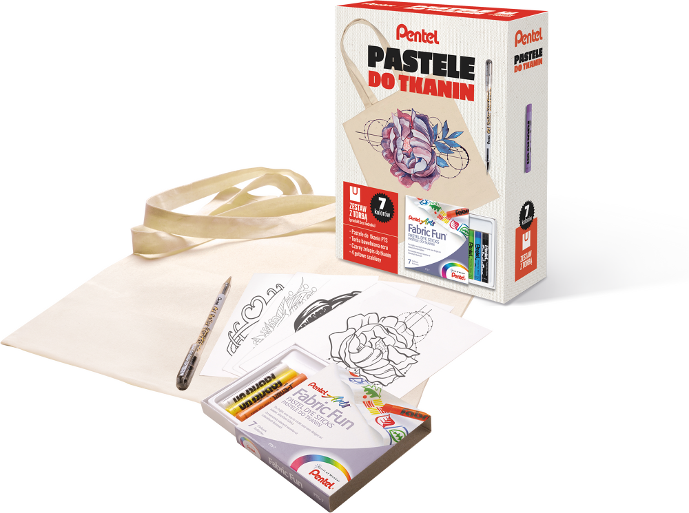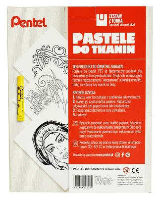 W zestawie: torba, pastele do tkanin, długopis żelowy