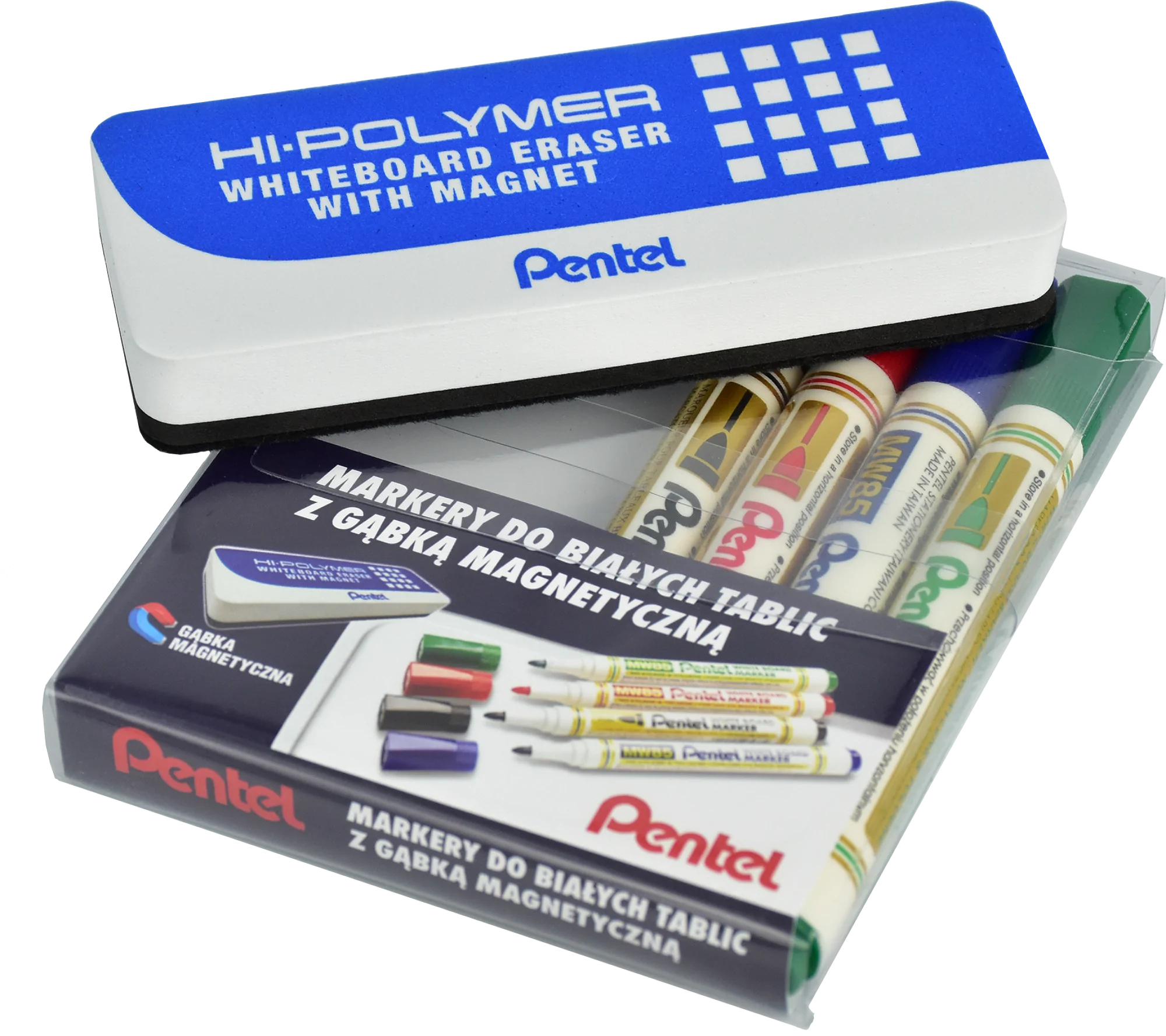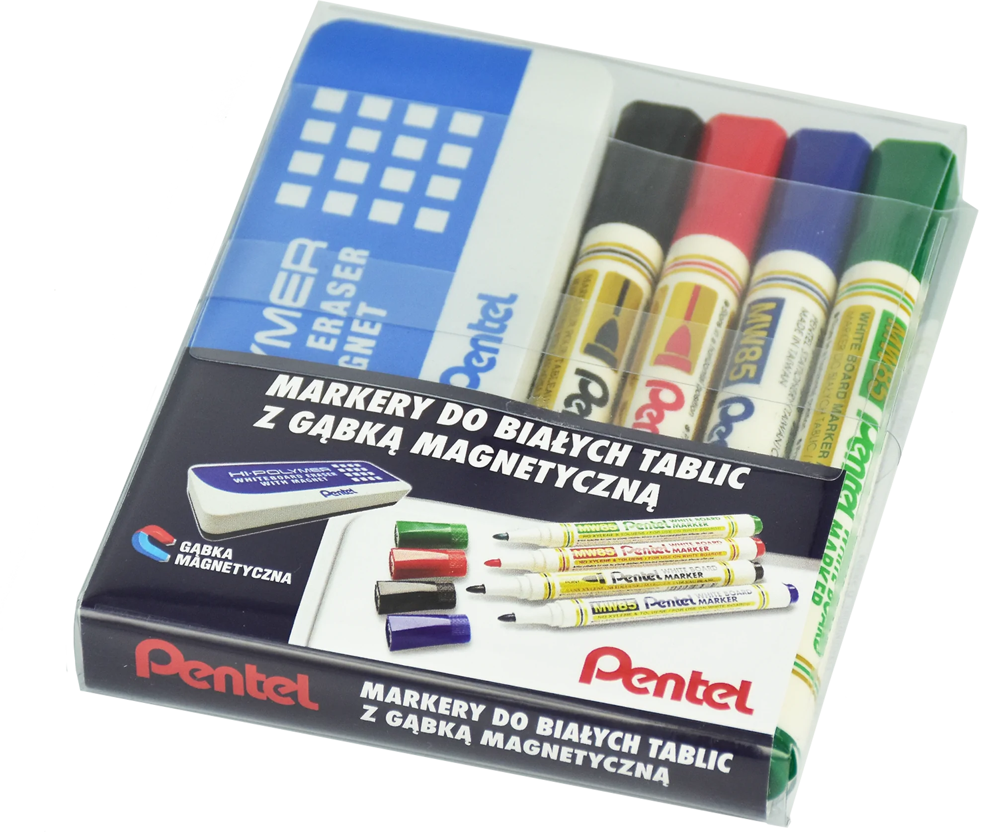 Komplet 4 ekonomicznych markerów do białych i ceramicznych tablic. Tusz jest łatwo usuwalny z powierzchni tablicy, nie pozostawia na niej trwałych śladów. Niezbędny do pracy w każdym biurze, pracowni i na uczelni. W zestawie znajduje się również gąbka magnetyczna, która z łatwością przylega do powierzchni tablicy, dzięki czemu zawsze masz ją pod ręką. Gąbka skutecznie usuwa ślady po markerach nie pozostawiając smug i zarysowań.